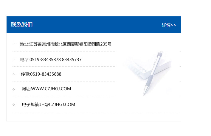 地址:常州市新北區友邦商務大廈1幢16、17層  電話:0519-85101652  傳真:0519-85112595  郵編:213022  網址:www_cz-jiayue_cn.dsyyyb.com  郵箱:xiajifengaa@163.com